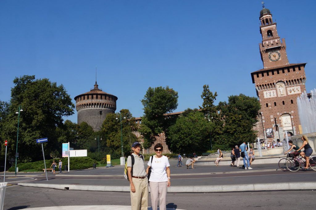 En el registro gráfico Beatriz Jaramillo Vélez y Alfredo Vanegas Montoya. Catillo Sforzesco y Torre del Filarete, Milán, Italia. Construcción iniciada en 1360. Estilo Renacimiento, Gótico. Junto con El Duomo, La Catedral de Milán, se constituye este castillo en obra cimera de la arquitectura universal. Baluartes, salas y torreones están decorados con pinturas de Leonardo Da Vinci, Bernardino Butinoni, Donato Bramante y Bernardino Zenale. Posee Iglesia de Culto Católico, Museo de Arte Antiguo, Pinacoteca, Museo de Instrumentos Musicales, Colección de Artes aplicadas, Muebles Antiguos, Esculturas de Madera y es subsede del Museo Arqueológico de Milán.