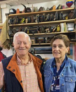 Beatriz y Alfredo. Al fondo colección de carrieles en Restaurante del Parque Principal de Jericó, Antioquia, Colombia.