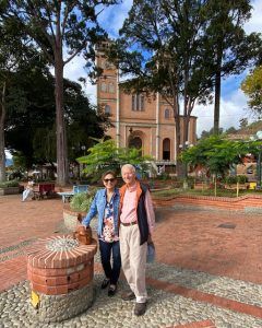 Beatriz Jaramillo Vélez y Alfredo Vanegas Montoya, frente a la Catedral, Parque Principal de Jericó, Antioquia, Colombia. Noviembre 15 de 2024