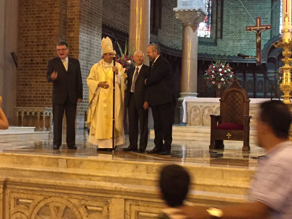 En el registro gráfico Monseñor Mauricio Vélez García, simbólicamente Obispo titular de Lapda, antigua Arquidiócesis de Cartago en Túnez, Africa y Obispo auxiliar, en el gobierno eclesiástico, de la Arquidiócesis de Medellin, Colombia, Jairo Hernán Mejía Cuartas, Jorge Eduardo Acevedo Uribe y Alfredo Vanegas Montoya. Catedral Metropolitana, Altar Mayor, Medellín, Colombia. Culto Católico. Construcción iniciada en 1890 y terminada en 1931. Estilo Neorrománico, diseñada por Emile Carré. Las columnas de El Baldaquino, diseñado por Giovanni Buscaglione, son de mármol rosado mandorlato de Verona, Italia. La mesa del Altar Mayor es de mármol blanco de Carrara, Italia. Ostenta al frente una bella réplica de La Ultima Cena de Leonardo Da Vinci. Los vitrales, también concebidos por Buscaglione, fueron construidos en talleres españoles por la Sociedad Maumejean de Vidrieras Artísticas fundada en Francia por Jules Pierre Maumejean.