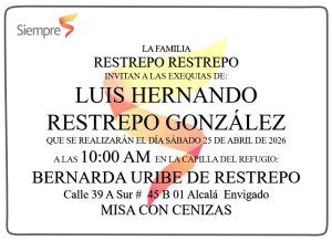 Con profundo dolor registramos el fallecimiento, en Envigado el 23 de abril de 2026, de nuestro dilecto amigo vinculado a familias apreciables de Envigado, Sabaneta y Medellín, Colombia y Nueva York, Estados Unidos.
