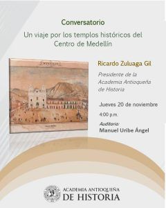 Conversatorio dirigido por el Señor Presidente de la Academia Antioqueña de Historia Don Ricardo Zuluaga Gil en el Auditorio Manuel Uribe Ángel de la Academia el 20 de noviembre de 2025 a las 4:00 de la tarde.