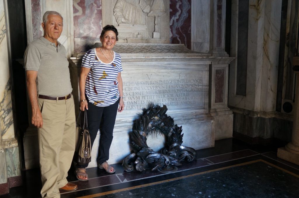Tumba del Poeta Dante Alighieri en Rávena, Italia. Traducción del latín del Epitafio: “Los derechos de la monarquía, los cielos y las aguas de Flegetonte visitando canté, hasta que quiso mi destino mortal. Sin embargo, como mi alma fue huésped en lugares mejores y más beata alcanzó entre las estrellas a su Creador, aquí estoy encerrado yo, Dante, exiliado de la patria tierra, generado por Florencia, madre de poco amor”. En Florencia, donde el poeta nació, un sepulcro vacío espera los despojos mortales que en Rávena yacen.